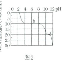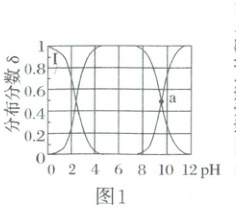 1.C 曲线Ⅰ对应物质的分布分数随pH增大逐渐减小,pH=0时,溶液呈强酸性,故曲线Ⅰ对应的离子为$^+NH_3CH_2COOH$,A 正确;a 点时$c(^+NH_3CH_2COO^-) = c(NH_3CH_2COO^-)$,$K_2=\frac{c(^+H)· c(NH_3CH_2COO^-) }{c(^+NH_3CH_2COO^-)} =c(^+H)=10^{-9.6}$,故此时pH=9.6,B正确;b点对应溶液pH=6,滴入10 mL NaOH溶液,该点溶液中存在电荷守恒:$c(^+H)+c(Na^+)+c(^+NH_3CH_2COOH)=c(OH^-)+c(Cl^-)+c(NH_2CH_2COO^-)$,而$c(^+H)>c(OH^-)$、$c(Na^+)=c(Cl^-)$,故$c(^+NH_3CH_2COOH)<c(NH_2CH_2COO^-)$,C错误;c点加入20 mLNaOH溶液,所得溶液中溶质为$NH_2CH_2COONa$,结合质子守恒可知,$2c(^+NH_3CH_2COOH)+c(^+NH_3CH_2COO^-)+c(^+H)=c(OH^-)$,D正确。