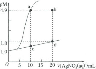 3.C A项,根据离子反应$Ag^++Cl^-\rightleftharpoons AgCl\downarrow$和$Ag^++\frac{1}{2}SO_4^{2-}\rightleftharpoons\frac{1}{2}Ag_2SO_4\downarrow$可知,滴入相同体积的$AgNO_3$溶液,消耗的$Cl^-$的物质的量更多,则剩余的$Cl^-$的物质的量更少,因为$Cl^-$和$SO_4^{2-}$的物质的量浓度相同,故剩余的$Cl^-$的pM值更大,故a点所在曲线代表$-lgc(Cl^-)$与滴入的$AgNO_3$溶液的体积的关系,a点对应溶液中$c(Cl^-)=1.0×10^{-4.9}mol· L^{-1}$,室温下,$K_{sp}(AgCl)=1.0×10^{-4.9}×1.0×10^{-4.9}=1.0×10^{-9.8}$,A错误;B项,滴入20mL0.1mol·L^{-1}AgNO_3溶液,10mL0.1mol·L^{-1}Na_2SO_4溶液恰好完全反应,根据图像可知,d点所在曲线代表$-lgc(SO_4^{2-})$与滴入的$AgNO_3$溶液的体积的关系,d点对应溶液中$c(SO_4^{2-})=1.0×10^{-1.8}mol· L^{-1}$,则溶液中$c(Ag^+)=2.0×10^{-1.8}mol· L^{-1}$,室温下,$K_{sp}(Ag_2SO_4)=(2.0×10^{-1.8})^2×1.0×10^{-1.8}=4.0×10^{-5.4}$。a点对应溶液中的$c(Ag^+)=1.0×10^{-4.9}mol· L^{-1}$,d点对应溶液中的$c(Ag^+)=2.0×10^{-1.8}mol· L^{-1}$,c点对应溶液中$Na_2SO_4$还剩余一半,c点对应溶液中的$c(SO_4^{2-})$大于d点对应溶液中的$c(SO_4^{2-})$,c、d两点温度相同(均为室温下),$K_{sp}(Ag_2SO_4)$相同,则c点对应溶液中的$c(Ag^+)$小于d点对应溶液中的$c(Ag^+)$,故a、c、d点对应溶液中,$c(Ag^+)$最大的是