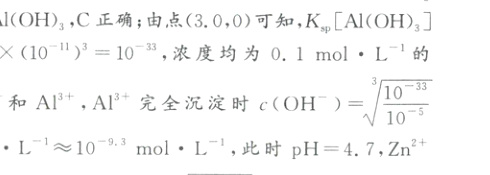 ,C正确;由点$(3.0,0)$可知,$K_{sp}[Al(OH)_{3}]=1×(10^{-11})^{3}=10^{-33}$,浓度均为$0.1 mol·L^{-1}$的$Zn^{2+}$和$Al^{3+}$,$Al^{3+}$完全沉淀时$c(OH^{-})=\sqrt[3]{\frac{10^{-33}}{10^{-5}}} mol·L^{-1}\approx10^{-9.3} mol·L^{-1}$,此时$pH=4.7$,$Zn^{2+}$开始沉淀时$c(OH^{-})=\sqrt{\frac{10^{-16.2}}{0.1}} mol·L^{-1}=10^{-7.6} mol·L^{-1}$,此时$pH=6.4$,因此调节溶液$pH$为$4.7\sim6.4$,可将浓度均为$0.1 mol·L^{-1}$的$Zn^{2+}$和$Al^{3+}$完全分离,D正确。