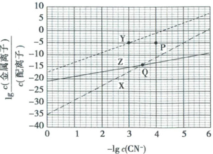 4. (2024·河北卷)在水溶液中,$CN^{-}$可与多种金属离子形成配离子。X、Y、Z三种金属离子分别与$CN^{-}$形成配离子达平衡时,$lg\frac{c(金属离子)}{c(配离子)}$与$-lgc(CN^{-})$的关系如图。