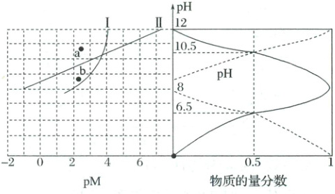 C项,由$K_{sp}[M(OH)_2]=c(M^{2+})· c^{2}(OH^-)$可得$c(M^{2+})=\frac{K_{sp}[M(OH)_2]}{c^{2}(OH^-)}=\frac{K_{sp}[M(OH)_2]}{[\frac{1×10^{-14}}{c(H^+)}]^2}=\frac{c^{2}(H^+)· K_{sp}[M(OH)_2]}{1×10^{-28}}$,则$pM=-\lg c(M^{2+})=2pH-\lg K_{sp}[M(OH)_2]-28$,图像Ⅱ是直线,故曲线Ⅱ表示$M(OH)_2$的溶解平衡曲线,曲线Ⅰ表示$MA$的溶解平衡曲线,C错误;