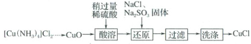 2.D 配合物$[Cu(NH_{3})_{4}]Cl_{2}$中四氨合铜离子为内界、氯离子为外界,配合物在溶液中电离出四氨合铜离子和氯离子,不能电离出氨分子,故A错误;“酸溶”时不用稀硝酸的主要原因是稀硝酸具有强氧化性,会将亚硫酸根离子氧化为硫酸根离子,导致亚硫酸根离子无法将溶液中的铜离子还原为氯化亚铜沉淀,故B错误;由分析可知,“还原”发生的反应为$2Cu^{2 + } + SO_{3}^{2 - } + 2Cl^{-} + H_{2}O=2CuCl\downarrow + SO_{4}^{2 - } + 2H^{ + }$,反应生成的氢离子会使溶液$pH$减小,故C错误;由题意可知,氯化亚铜在潮湿空气中易被氧化,所以“洗涤”时先用水再用乙醇会使氯化亚铜被氧化,降低产品的纯度,故D正确;故选D。