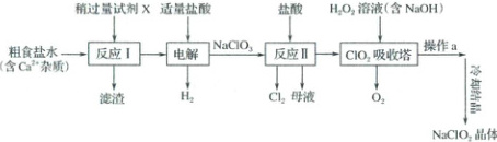 1.B 粗食盐水中含有杂质$Ca^{2 + }$,加入过量碳酸钠可将所有$Ca^{2 + }$完全沉淀,故滤渣为$CaCO_{3}$,A项正确,流程中两处盐酸,第一次用盐酸是除碳酸钠,第二次用盐酸是还原氯酸钠生成二氧化氯,两处$HCl$的作用不相同,B项错误;由于$NaClO_{2}$受热易分解,因此利用减压蒸发,C项正确;反应Ⅱ中产生$Cl_{2}$的化学方程式为$2NaClO_{3} + 4HCl=2ClO_{2}\uparrow + Cl_{2}\uparrow + 2NaCl + 2H_{2}O$,$ClO_{2}$吸收塔中产生$O_{2}$的化学方程式为$2ClO_{2} + 2NaOH + H_{2}O_{2}=2NaClO_{2} + O_{2}\uparrow + 2H_{2}O$,故理论上,产生$Cl_{2}、O_{2}$的物质的量之比为$1:1$,D项正确。答案选B。