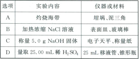 4.AD 海带是固体,灼烧固体需要在坩埚中进行,坩埚下方需垫泥三角,A正确;表面皿不能加热,加热浓缩NaCl溶液时应用蒸发皿,B错误;NaOH固体有腐蚀性,称量时需盛放在烧杯或称量瓶中,C错误;移液管可从试剂瓶中精确量取其规格对应体积的液体并转移至锥形瓶中,D正确。