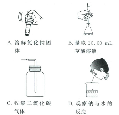 2.B 溶解氯化钠固体一般在小烧杯中进行,如果在试管中溶解少量氯化钠固体,应敞口左右轻轻振荡试管使氯化钠固体溶解,不能用拇指堵住试管口上下振荡,A错误;可用酸式滴定管量取20.00mL草酸溶液,从酸式滴定管中放出液体时,酸式滴定管的活塞柄向右,左手从滴定管后向右伸出,拇指在滴定管前,食指及中指在管后,三指平行地轻轻拿住活塞柄,滴定管下端伸入锥形瓶口内约1cm,故B正确;用排空气法收集二氧化碳气体没有出气导管,会使瓶内压强过大,产生危险,C错误;钠与水反应剧烈,实验时不能近距离俯视烧杯,观察钠与水的反应时应佩戴护目镜、在远处观察,D错误。