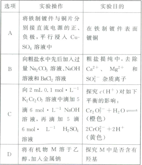 2.C 在铁制镀件表面镀铜时,待镀件应连接电源负极,铜片应连接电源正极,A不符合题意;粗盐提纯时,加入$BaCl_2$溶液去除$SO_4^{2-}$,加入$NaOH$溶液去除$Mg^{2+}$,加入$Na_2CO_3$溶液去除$Ca^{2+}$与过量的$Ba^{2+}$,$Na_2CO_3$溶液不能先于$BaCl_2$溶液加入,故B不符合题意;$K_2Cr_2O_7$溶液中存在平衡:$Cr_2O_7^{2-}$(橙色)$+H_2O\rightleftharpoons2CrO_4^{2-}$(黄色)$+2H^+$,滴加$NaOH$溶液,$c(H^+)$减小,平衡正向移动,滴加$H_2SO_4$溶液,$c(H^+)$增大,平衡逆向移动,故可通过观察溶液颜色变化来探究氢离子浓度对平衡移动的影响,C符合题意;乙醇中含有羟基,可与$Na$反应,故无法探究有机物M中是否含有羟基,D不符合题意。
