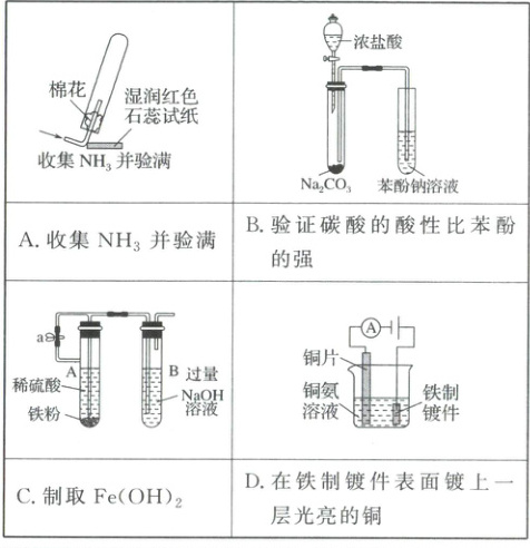 4.C 氨气密度比空气小,应用向下排空气法收集,导气管应伸入试管底部,故A不符合题意;HCl易挥发,二氧化碳中混有HCl,不能验证碳酸的酸性比苯酚的强,故B不符合题意;A试管内铁和稀硫酸反应生成硫酸亚铁和氢气,用氢气排出B试管内的空气后,关闭止水夹a,A中硫酸亚铁溶液被压入B中与氢氧化钠反应生成$\mathrm{Fe(OH)_2}$沉淀,故C符合题意;乙装置,铁作阳极,铁失电子被腐蚀,在铁件表面镀一层光亮的铜,应该铁作阴极,故D不符合题意;答案选C。