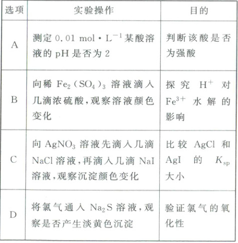 $0.01\ mol·L^{-1}$的多元弱酸溶液的$pH$也可能为$2$,A不符合题意;浓硫酸稀释时放热,故将浓硫酸滴入稀$Fe_2(SO_4)_3$溶液中,体系温度升高,干扰$H^+$对$Fe^{3+}$水解影响的探究,B不符合题意;向$AgNO_3$溶液先滴入几滴$NaCl$溶液,有$AgCl$生成,再滴入几滴$NaI$溶液,与溶液中过量的$Ag^+$反应生成黄色沉淀,不能证明发生了沉淀的转化,无法比较$AgCl$和$AgI$的$K_{sp}$大小,C不符合题意。