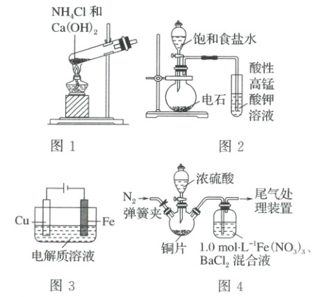 3.C 利用$\mathrm{NH_4Cl}$和$\mathrm{Ca(OH)_2}$固体混合物制取氨气,试管口应该略向下倾斜,故A不能达到相应实验目的;利用电石(含CaS杂质)制备并检验乙炔,生成的乙炔中含有$\mathrm{H_2S}$、$\mathrm{PH_3}$等还原性气体,故B 不能达到相应实验目的;铜做阳极失去电子进入电解质中,在氨水中铜离子会与氨分子形成稳定的铜氨络离子,会在阴极生成更光亮的铜镀层,故C能达到相应实验目的;$\mathrm{NO_3^-}$在酸性条件下也能将$\mathrm{SO_2}$氧化为$\mathrm{SO_4^{2-}}$,故D不能达到相应实验目的;答案选C。