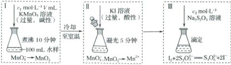 5. (2025·黑吉辽蒙卷)化学需氧量($COD$)是衡量水体中有机物污染程度的指标之一,以水样消耗氧化剂的量折算成消耗$O_{2}$的量(单位为$mg·L^{-1}$)来表示。碱性$KMnO_{4}$不与$Cl^{-}$反应,可用于测定含$Cl^{-}$水样的$COD$,流程如图。