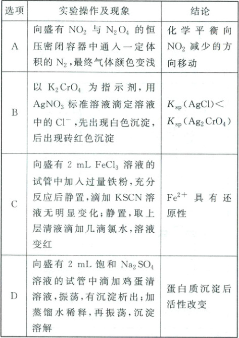 3.C 恒压密闭容器中通入$N_2$、$NO_2$、$N_2O_4$浓度减小,故混合体系颜色变浅,同时反应物、生成物分压均减小,相当于减小压强,平衡向气体分子数增大的方向移动,即向$NO_2$增加的方向移动,A不符合题意;$AgCl$和$Ag_2CrO_4$类型不同,$K_{sp}(AgCl)$与$K_{sp}(Ag_2CrO_4)$的表达式不同,无法根据沉淀出现的先后顺序判断两者大小关系,B不符合题意;$FeCl_3$溶液中加入过量铁粉,静置后滴加$KSCN$溶液无明显变化,说明此时所得溶液中$Fe$元素以$Fe^{2+}$形式存在,取上层清液滴加几滴氯水后,溶液变红,说明$Fe^{2+}$被氧化为$Fe^{3+}$,$Fe^{2+}$体现还原性,C符合题意;鸡蛋清溶液遇饱和$Na_2SO_4$溶液发生盐析,加水稀释后恢复,不改变蛋白质的活性,D不符合题意。