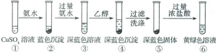4.D 向$CuSO_4$溶液中加入氨水生成蓝色$Cu(OH)_2$沉淀,继续滴加过量氨水,$Cu(OH)_2$沉淀转化为$[Cu(NH_3)_4]SO_4$深蓝色溶液,再加入乙醇,可以降低$[Cu(NH_3)_4]SO_4$的溶解度,使$[Cu(NH_3)_4]SO_4$析出,过滤后洗涤可得到$[Cu(NH_3)_4]SO_4$深蓝色固体,向$[Cu(NH_3)_4]SO_4$固体中加入过量浓盐酸,$[Cu(NH_3)_4]SO_4$固体溶解,转化为$[CuCl_4]^{2-}$黄绿色溶液。