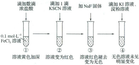已知:$[FeCl_{4}]^{-}$为黄色、$[Fe(SCN)]^{2+}$为红色、$[FeF_{6}]^{3-}$为无色。