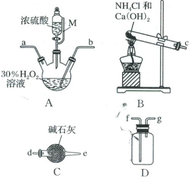 (2)由分析可知,制备氨气后无需干燥,但需要防止倒吸,所以仪器的连接顺序为$c→g→f→b→a→$尾气处理;氨气极易溶于水,A、B之间放置安全瓶D以防止倒吸,则D装置的作用为防止装置A中液体倒吸入装置B中;由仪器构造可知,仪器M的名称为恒压滴液漏斗;