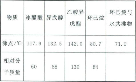 2. (2025·河南郑州二模)乙酸异戊酯在常温下是具有香蕉味的无色液体,常用于香精添加剂,其制取反应为$(CH_{3})_{2}CHCH_{2}CH_{2}OH+CH_{3}COOH\xrightarrow{H^{+}}CH_{3}COOCH_{2}CH_{2}CH(CH_{3})_{2}+H_{2}O$。相关物质的沸点及相对分子质量如下表: