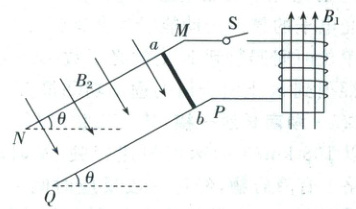 10.(2025·河北保定一模)如图所示,间距d=0.5 m、倾角θ=30°、足够长的光滑平行金属导轨MN、PQ固定在方向垂直导轨平面向下、磁感应强度大小B₂=2 T的匀强磁场中;匝数N=1 000匝、横截面积S=0.01 m²、电阻r=1 Ω的线圈处于方向竖直向上、磁感应强度大小B₁随时间的变化规律为B₁=(0.1+0.2t)T的磁场中,线圈两端通过导线分别与导轨的M、P端连接。t=0时刻闭合开关S,同时将质量m=1 kg、长度也为d=0.5 m、电阻R=1 Ω的金属棒ab从导轨上端由静止释放,运动过程中金属棒与导轨始终垂直且接触良好。已知重力加速度g=10 m/s²,导轨电阻不计,则下列说法正确的是 (