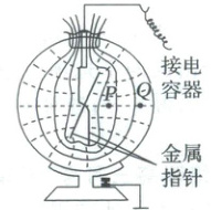 5. (2025·浙江嘉兴一模)如图所示,将静电计与电容器(图中未画出)相连,可检测带电电容器的两极间的电压变化。带电静电计的金属指针和圆形金属外壳的空间内存在电场,分别用实线和虚线表示电场线和等势面,该空间内有$ P、Q $两点,则 (
