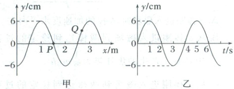解析:由题图乙可知,t=2s时,质点P正沿y轴负方向运动,根据波动与振动的关系可知,波沿x轴负方向传播,故A错误;波传播的速度大小为$v=\frac{\lambda}{T}=\frac{2}{4}m/s=0.5m/s,$故B错误;将波形沿x轴负方向移动0.5m的距离,可知此时P点在波谷,Q位移为$y=6\sin(\frac{0.25}{2}×2\pi)cm=3\sqrt{2}cm,$故C正确;由于P、Q水平距离并不等于半波长的奇数倍,因此两质点的振动方向并不一定相反,故D错误。
