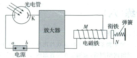 6. (2025·四川宜宾三模)如图是工业生产中用到的光控继电器示意图(部分),它由电源、光电管、放大器、电磁继电器等组成。当用黄光照射光电管阴极$ K $时,没有发生光电效应,当用蓝光照射光电管阴极$ K $时,发生了光电效应。则 (