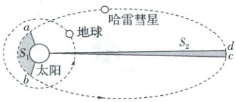 (2025·浙江卷)地球和哈雷彗星绕太阳运行的轨迹如图所示,彗星从$a$运行到$b$、从$c$运行到$d$的过程,与太阳连线扫过的面积分别为$S_{1}$和$S_{2}$,且$S_{1} > S_{2}$。彗星在近日点与太阳中心的距离约为地球公转轨道半径的0.6倍,则彗星(