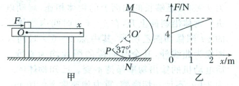 [例 5] (2025·安徽合肥一模) 如图甲所示,一小物块放置在水平台面上,在水平推力 $F$ 的作用下,物块从坐标原点 $O$ 由静止开始沿 $x$ 轴运动,$F$ 与物块的位置坐标 $x$ 的关系如图乙所示。物块在 $x = 2\ m$ 处从平台飞出,同时撤去 $F$,物块恰好由 $P$ 点沿其切线方向进入竖直圆轨道,随后刚好从轨道最高点 $M$ 飞出。已知物块质量为 $0.5\ kg$,物块与水平台面间的动摩擦因数为 $0.7$,轨道圆心为 $O'$,半径为 $0.5\ m$,$MN$ 为竖直直径,$\angle PO'N = 37°$,重力加速度 $g = 10\ m/s^2$,$\sin37° = 0.6$,不计空气阻力。求: