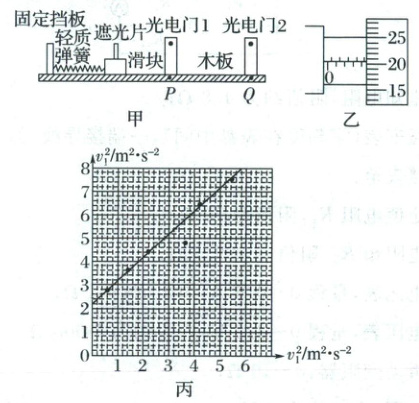 (用第1、2小问中所给的字母表示);(3) 改变弹簧的压缩程度进行多次实验,并计算得出多组滑块通过$P$点和$Q$点的速度$v_1$和$v_2$,根据下表中的数据在坐标纸上描点连线,作出$v_1^2 - v_2^2$图像如图丙所示;