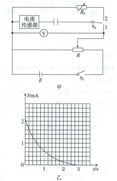 2. (2025·山东菏泽二模)我国新能源汽车年产量现已突破1000万辆,成为全球首个达成这一成就的国家。在电动汽车等领域,电容储能技术得到了广泛应用。某同学设计图甲所示电路,探究不同电压下电容器的充、放电过程,器材如下: