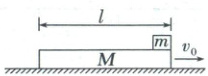 [例 7] (多选)(2025·湖南株洲模拟) 如图,质量为 $m$ 的小物块(可视为质点)静止在质量为 $M$、长为 $l$ 的木板上的最右端,木板放在光滑水平桌面上,某时刻木板以速度 $v_0$ 开始运动。已知物块与木板间的滑动摩擦力大小为 $F_f$,当物块从木板左端离开时 (