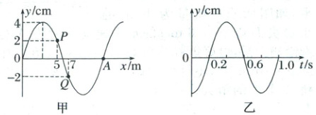 8.(2025·湖北省三模)一列简谐横波沿$ x $轴方向传播,在$ t = 0.6 \, s $时刻的波形图如图甲所示,此时质点$ P $的位移为$ +2 \, cm $,质点$ Q $的位移为$ -2 \, cm $,波上质点$ A $的振动图像如图乙所示,下列说法正确的是 (