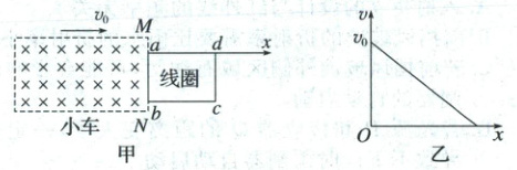 7.(2025·福建福州市检测)图甲是某小车利用电磁感应实现制动缓冲的示意图:水平地面固定有闭合矩形线圈$ abcd $,线圈总电阻为$ R $,$ ab $边长为$ L $;小车底部安装有电磁铁,其磁场可视为磁感应强度大小为$ B $、方向竖直向下的匀强磁场,磁场边界$ MN $与$ ab $边平行。当小车沿水平方向通过线圈$ abcd $上方时,线圈与磁场的作用使小车做减速运动,从而实现缓冲。以$ a $点为坐标原点、水平向右为正方向建立$ x $轴,小车速度$ v $随$ x $的变化图像如图乙所示,不计一切摩擦阻力,则缓冲过程 (