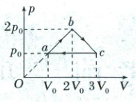 解析:气体在$a\rightarrow b$过程中因pV乘积变大,由$\frac{pV}{T}=C$知温度升高,故A错误;气体在$b\rightarrow c$过程中因pV乘积变小,可知温度降低,内能减小,故B错误;在p - V图像中,图像与坐标轴围成的面积等于气体对外做功,可知气体在$a\rightarrow b$过程和$b\rightarrow c$过程对外界做的功相等,故C正确;气体在一次循环过程中从a到b再到c过程对外做功,从c到a过程外界对气体做功,整个过程中气体对外做功,且内能不变,则气体会从外界吸收热量,故D错误。
