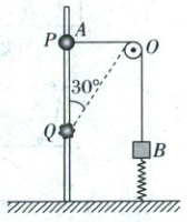 10.(2025·海南海口模拟预测)如图所示,光滑竖直杆底端固定在地面上,杆上套有一质量为$ m $的小球$ A $(可视为质点),一根竖直轻弹簧一端固定在地面上(弹簧劲度系数为$ k $),另一端连接质量也为$ m $的物块$ B $,一轻绳跨过定滑轮$ O $,一端与物块$ B $相连,另一端与小球$ A $连接,定滑轮到竖直杆的距离为$ L $。初始时,小球$ A $在外力作用下静止于$ P $点,已知此时整根轻绳伸直无张力且$ OP $间细绳水平、$ OB $间细绳竖直,现将小球$ A $由$ P $点静止释放,$ A $沿杆下滑到最低点$ Q $时$ OQ $与杆之间的夹角为$ 30° $,不计滑轮大小及摩擦,重力加速度大小为$ g $,下列说法正确的是 (