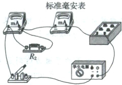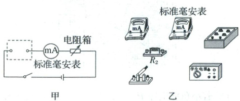 (6)同学要将该电流计改装为量程为$ 20 \, mA $的电流表,将阻值为$ R_{2} $的定值电阻与$ 2 \, mA $电流计连接,进行改装,然后利用一标准毫安表根据图甲所示电路对改装后的电表进行检测(虚线框内是改装后的电表)