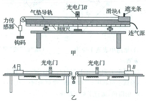 第一小组:验证加速度与力的关系器材包含:导轨上有刻度尺的气垫导轨(含气泵)、光电门$ B $、数字计时器、带挡光片的滑块$ A $、钩码若干、力的传感器(质量不计)和天平。