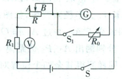 (1)按图中的实验电路图进行实物连接,将滑动变阻器的滑片置于$ B $端,$ R_{1} $为定值电阻,闭合开关$ S $,断开开关$ S_{1} $,调节滑动变阻器滑片的位置,使电压表的读数为$ U_{1} $(指针偏转超过量程的三分之一),电流计满偏;