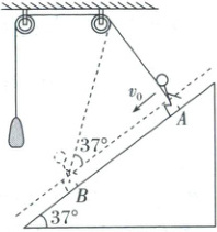 (2025·江西景德镇·三模)运动员为了练习腰部力量,在腰部拴上轻绳然后沿着斜面下滑,运动的简化模型如图所示,倾角为37°的光滑斜面固定放置,质量为m运动员与质量为m的重物通过轻质细绳连接,细绳跨过天花板上的两个定滑轮,运动员从斜面上的某点由静止开始下滑,当运动到A点时速度大小为v₀ = $\frac{6}{5}\sqrt{2gL}$,且此时细绳与斜面垂直,当运动到B点时,细绳与斜面的夹角为37°,已知A、B两点之间的距离为2L,重力加速度为g,运动员在运动的过程中一直未离开斜面,细绳一直处于伸直状态,不计细绳与滑轮之间的摩擦,运动员与重物(均视为质点)总在同一竖直面内运动,sin 37° = 0.6,cos 37° = 0.8,下列说法正确的是()
