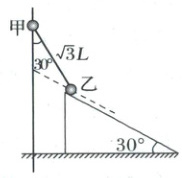 (2025·河北廊坊高三期末)如图所示,倾角为30°的光滑斜面固定在水平地面上,在斜面体左侧的适当位置固定一光滑竖直硬杆,质量均为m的两小球(均视为质点)用长为$\sqrt{3}L$的轻质硬杆连接,甲套在竖直硬杆上,乙放置在斜面上,甲、乙由静止释放时,轻质硬杆与竖直硬杆的夹角为30°,当轻质硬杆与斜面刚好平行时,乙的动能为(