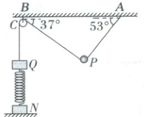 (2025·黑龙江哈三中二模)如图所示,两根轻绳连接质量为m的小球P,右侧绳一端固定于A点,左侧绳通过光滑定滑轮C连接一物块Q,质量相等的物块Q、N通过一轻弹簧连接,整个系统处于静止状态时,小球P位于图示位置,两绳与水平方向的夹角分别为53°和37°,此时物块N与地面间的压力恰好为零。现将小球P托至与A、B两点等高的水平线上,两绳均拉直且恰好无弹力,由静止释放小球P。已知A点与小球P间的绳长为L,sin 37° = 0.6,cos 37° = 0.8,重力加速度为g,求: