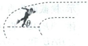 (3)武大靖通过侧身来调整身体与水平冰面的夹角,使场地对其作用力指向身体重心而实现平稳过弯,如图所示。求武大靖在(2)问中过弯时身体与水平面的夹角$ \theta $的大小。(不计空气阻力,重力加速度大小取$ 10 \, m/s^2 $,$\tan 22° = 0.40$、$\tan 27° = 0.51$、$\tan 32° = 0.62$、$\tan 37° = 0.75$)