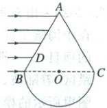 1. (2025·河南省模拟)如图所示,“水滴形”透明体其纵截面由等边三角形和半圆形组成,三角形的三个顶点分别为$ A、B、C $,边长为$ L $。一束平行于$ BC $边的光线入射到$ AB $边上,只有$ BD $区域的光线能够射入半球体,$ BD $长度等于$\frac{L}{4}$,不考虑反射,$\sqrt{13}=3.6$。光在真空中的传播速度为$ c $。求: