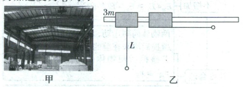 2. (2025·黑龙江·模拟预测)大型工厂的车间中有一种设备叫做天车如图甲所示,是运输材料的一种常用工具。此装置可以简化为如图乙所示的模型,足够长的光滑水平杆上套有一个质量为$3m$的滑块,滑块正下方用长为$L$不可伸长的轻绳悬挂一个质量为$m$的小球。开始两者均静止,现给小球一个水平初速度$v_0$(未知),小球恰好能达到与滑块等高的位置,此时滑块水平向右移动$s$,重力加速度为$g$,求: