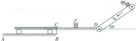 2. (2025·河南三模)如图所示,$AB$段为足够长的水平面,$CD$为光滑的水平导轨,质量为$M = 4\ kg$的小车静止在$AB$段,小车的上表面与$CD$面等高。倾角为$\alpha = 37^{\circ}$,长为$L = 7\ m$的传送带下端通过一小段光滑的圆弧轨道衔接于$D$点。已知传送带沿逆时针方向以恒定的速度$v_{0} = 4\ m/s$运动,可视为质点的质量为$m_{2} = 1\ kg$的物体乙静止放在$CD$段,物体乙到$C$点的距离为$x_{0} = 12\ m$,可视为质点的质量为$m_{1} = 3\ kg$的物体甲由传送带的顶端静止释放,经过一段时间两物体发生弹性正碰,物体乙滑上小车后经$t = 3\ s$的时间从小车的左端飞出,物体乙落地后不反弹。已知小车上表面到$AB$面的高度差为$h = 1.25\ m$,小车与$AB$段的动摩擦因数为$\mu_{2} = 0.05$,物体甲、乙与传送带以及小车上表面的动摩擦因数均为$\mu_{1} = 0.25$。重力加速度$g = 10\ m/s^2$,$\sin 37^{\circ} = 0.6$,$\cos 37^{\circ} = 0.8$。