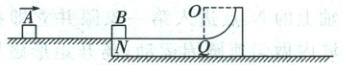 2. (2025·广东省联考)如图所示,紧靠在水平台右端的长木板上表面$NQ$水平且与平台等高,$NQ$的长度$L = 2\mathrm{m}$,长木板的右端为半径$R = 0.1\mathrm{m}$的$\frac{1}{4}$光滑圆弧,可视为质点的滑块$B$静止在长木板的左端。质量$m_\mathrm{A} = 1\mathrm{kg}$的滑块$A$在光滑水平平台上以初速度$v_0 = 6\mathrm{m/s}$向右匀速运动,一段时间后滑块$A$与滑块$B$发生弹性碰撞。已知滑块$B$的质量为$m_\mathrm{B} = 3\mathrm{kg}$,与$NQ$间的动摩擦因数$\mu = 0.1$,长木板的下表面光滑,重力加速度$g = 10\mathrm{m/s^2}$。