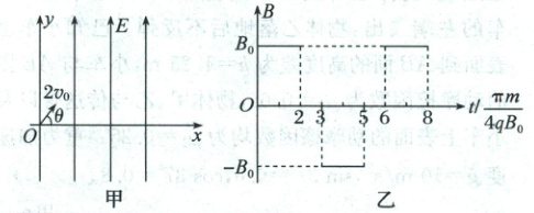 1. (2025·广东梅州市期末)如图甲所示,在竖直平面内建立$xOy$坐标系($y$轴竖直),在$x>0$区域有沿$y$轴正方向的匀强电场,电场强度大小为$E = \frac{mg}{q}$;在$x>0$区域,还有按图乙规律变化的磁场,磁感应强度大小为$B_0$,磁场方向以垂直纸面向外为正方向。$t = 0$时刻,有一质量为$m$、带电荷量为$+q$的小球(可视为质点)以初速度$2v_0$从原点$O$沿与$x$轴正方向夹角$\theta = \frac{\pi}{4}$的方向射入第一象限,重力加速度为$g$。求: