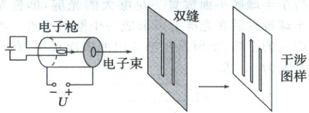 解析:仅增大加速电压U,电子速度增大、动量增大,由$p=\frac{h}{\lambda}$可知电子德布罗意波长变短,由双缝干涉条纹间距公式$\Delta x=\frac{L}{d}\lambda$可知条纹间距$\Delta x$会变小,故A错误;仅增大双缝的间距d,条纹间距$\Delta x$会变小,故B错误;由动能定理可得$eU=\frac{1}{2}mv^{2}$,则射入双缝的电子动量为$\sqrt{2meU}$,故C错误;由$\Delta x=\frac{L}{d}\lambda$和$\lambda=\frac{h}{\sqrt{2meU}}$,联立得双缝的间距$d=\frac{hL}{\Delta x\sqrt{2meU}}$,故D正确。