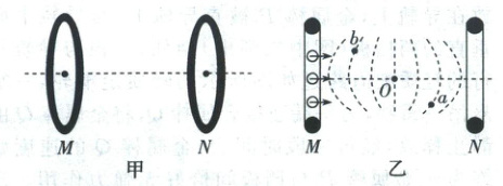 3. (2025·浙江台州二模)在电子显微镜中,电子束相当于光束,通过由电场或磁场构成的电子透镜实现会聚和发散作用。其中的一种电子透镜由两个金属圆环$ M、N $组成,其结构如图甲所示,图乙为图甲的截面示意图。显微镜工作时,两圆环的电势$ \varphi_N > \varphi_M $,图乙中虚线表示两圆环之间的等势面(相邻等势面间电势差相等),$ O $为水平虚线与竖直虚线的交点,$ a、b $两点关于$ O $点中心对称。现有一束电子经电场加速后,沿着平行于两金属圆环轴线的方向进入金属圆环$ M $。下列说法正确的是(