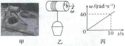 5. (多选)(2025·贵州贵阳高三调研)如图甲,辘轳是古代民间提水设施,由辘轳头、支架、井绳、水斗等部分构成。如图乙为提水设施工作原理简化图,某次需从井中汲取$ m = 2\ kg $的水,辘轳绕绳轮轴半径为$ r = 0.1\ m $,水斗的质量为$ 0.5\ kg $,井足够深且井绳的质量忽略不计。$ t = 0 $时刻,轮轴由静止开始绕中心轴转动,其角速度随时间变化规律如图丙所示,$ g $取$ 10\ m/s^2 $,则(