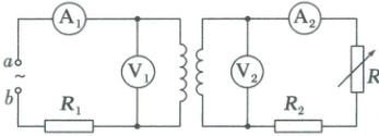 2. (2025·湖南长沙模拟)如图所示,理想变压器原线圈与阻值$ R_1 = 5\ \Omega $的定值电阻串联后接在输出电压恒定的正弦交流电源$ a、b $两端,副线圈电路中定值电阻$ R_2 = 10\ \Omega $,$ R $为可变电阻,电流表$ A_1、A_2 $和电压表$ V_1、V_2 $均为理想电表,理想变压器原、副线圈匝数之比为$ k = 5 $。改变可变电阻的阻值,电流表$ A_1、A_2 $和电压表$ V_1、V_2 $的示数变化量的绝对值分别为$ \Delta I_1、\Delta I_2、\Delta U_1、\Delta U_2 $,下列关系式正确的是(