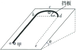如图所示,倾角为$\theta$的斜面固定于水平地面,斜面上固定有半径为$R$的半圆挡板和长为$7R$的直挡板。$a$为直挡板下端点,$bd$为半圆挡板直径且沿水平方向,$c$为半圆挡板最高点,两挡板相切于$b$点,$de$与$ab$平行且等长。小球乙被锁定在$c$点。小球甲从$a$点以一定初速度出发,沿挡板运动到$c$点与小球乙发生完全弹性碰撞,碰撞前瞬间解除对小球乙的锁定,小球乙在此后的运动过程中无其他碰撞。小球甲质量为$m_1$,两小球均可视为质点,不计一切摩擦,重力加速度大小为$g$。