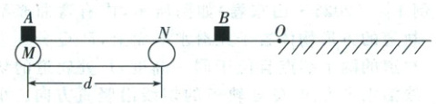 如图所示,长度为$d$的水平传送带$M$顺时针匀速运动。质量为$m$的小物块$A$在传送带左端$M$由静止释放。$A$还未与传送带达到相同速度时就从右端$N$平滑地进入光滑水平面$NO$,与向右运动的小物块$B$发生碰撞(碰撞时间极短)。碰后$A$、$B$均向右运动,从$O$点进入粗糙水平地面。设$A$与传送带间的动摩擦因数和$A$、$B$与地面间的动摩擦因数均为$\mu$,重力加速度为$g$。